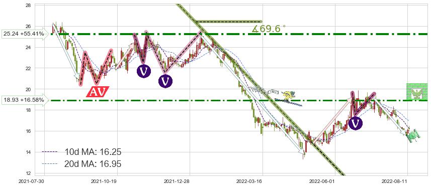 ♘ 阻力价格位18.93,可信任强度66.16%,距离最后交易2022-08-12形成的收盘价格16.24相差 +16.58%