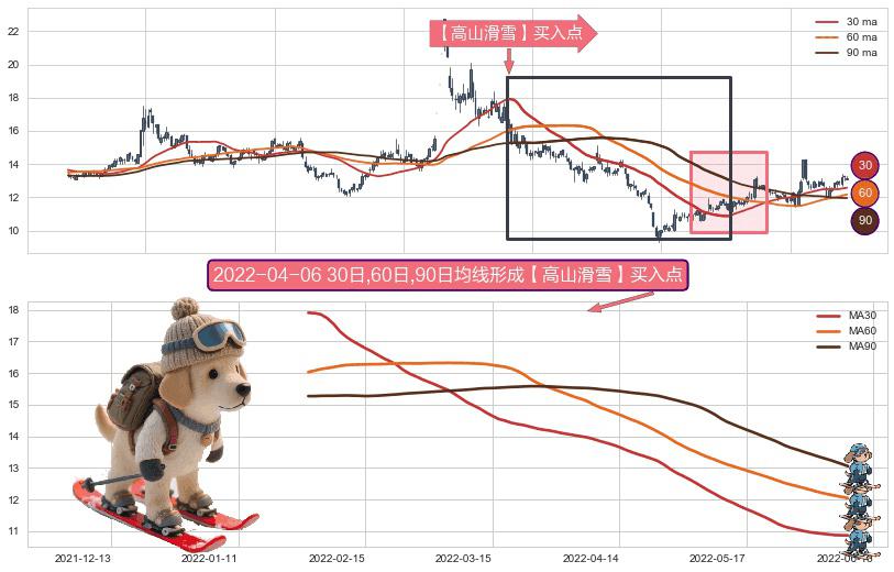 ⚀ 2022-01-26日-2022-06-09日显现 30日-60日-90日均线 【高山滑雪】买入点 看多信号,后市看涨,买入