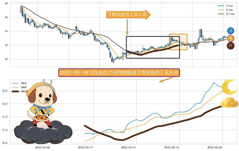 ⚀ 2022-05-13日-2022-06-30日显现 3日-8日-21日均线 【烘云托月】买入点 看多信号,后市看涨,买入