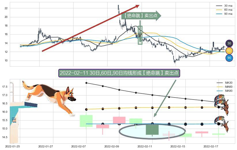 ⚀ 2022-02-11日显现 30日-60日-90日均线 【绝命跳】卖出点 看空信号,后市看跌,卖出