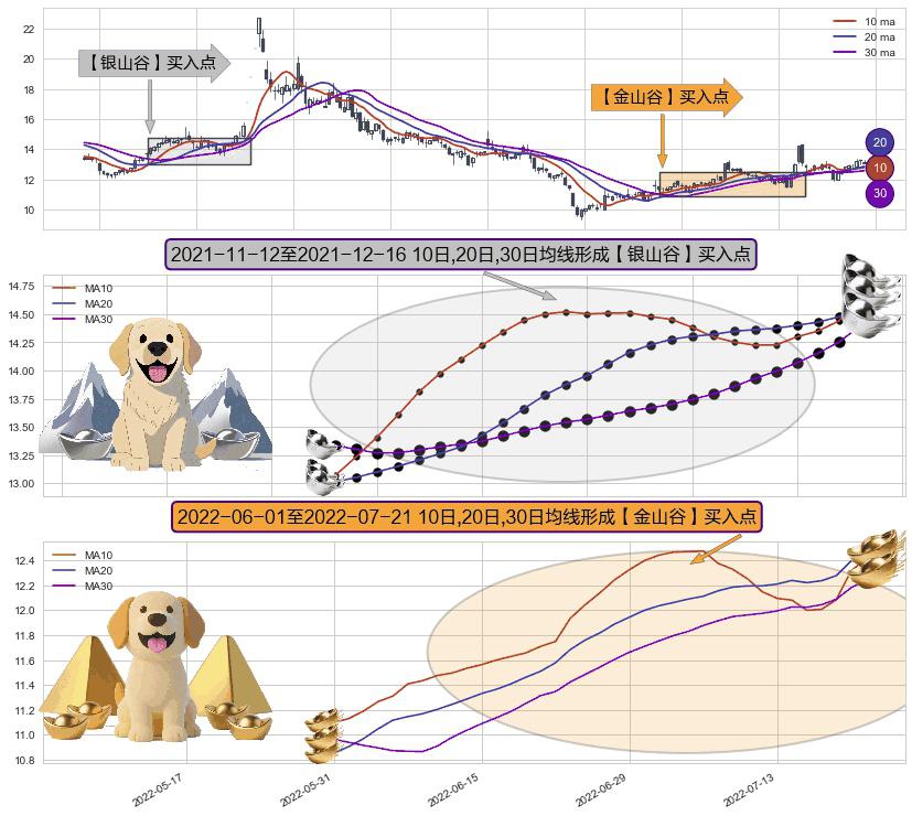 ⚃ 2022-06-02-日至2022-07-21-日显现 10日-20日-30日均线 【金山谷】买入点 其再次确认了买入信号,可靠性更强,买入