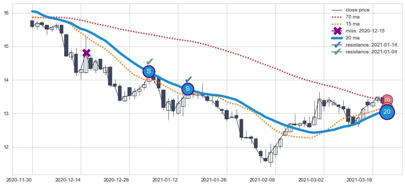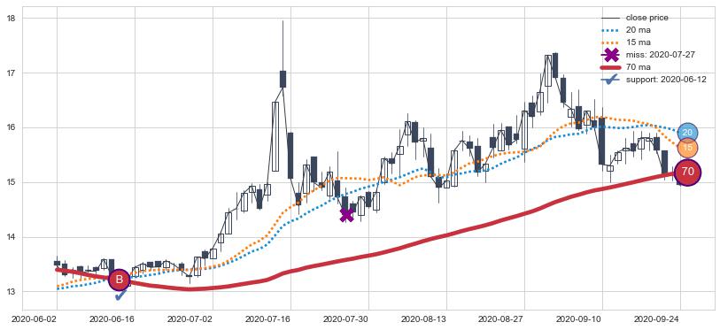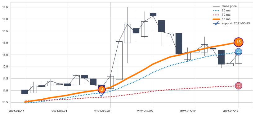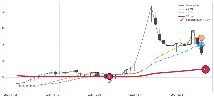 ⚁ MA3和MA8走势平行,且始终保持在短距离内,MA21始终在短中期均线下方,与短中期均线保持一定的距离,微微上行