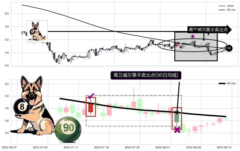 ⚀ 2022-08-02-日显现 葛兰威尔均线 90日均线 第⑧卖出点 下降趋势的中继信号,后市看跌,卖出信号