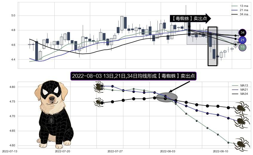 ⚀ 2022-08-03日显现 13日-21日-34日均线 【毒蜘蛛】卖出点 看空信号,后市看跌,卖出