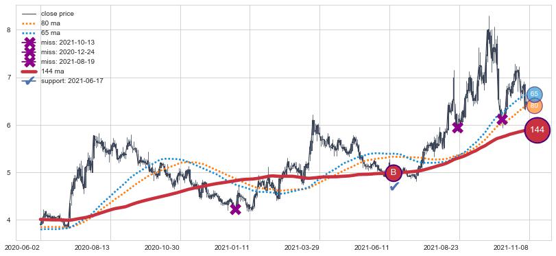 ⚁ MA3和MA8走势平行,且始终保持在短距离内,MA21始终在短中期均线下方,与短中期均线保持一定的距离,微微上行