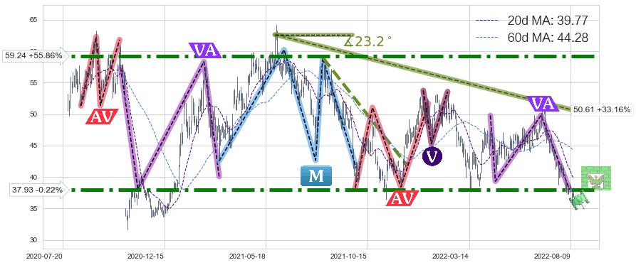 ➣ D点拟合预测价格22.97,距离最后交易收盘价格38.01相差 -39.58%