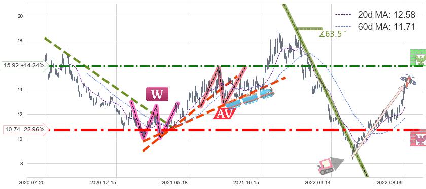 ♘ 支撑价格位10.74,可信任强度88.70%,距离最后交易2022-08-12形成的收盘价格13.94相差 -22.96%