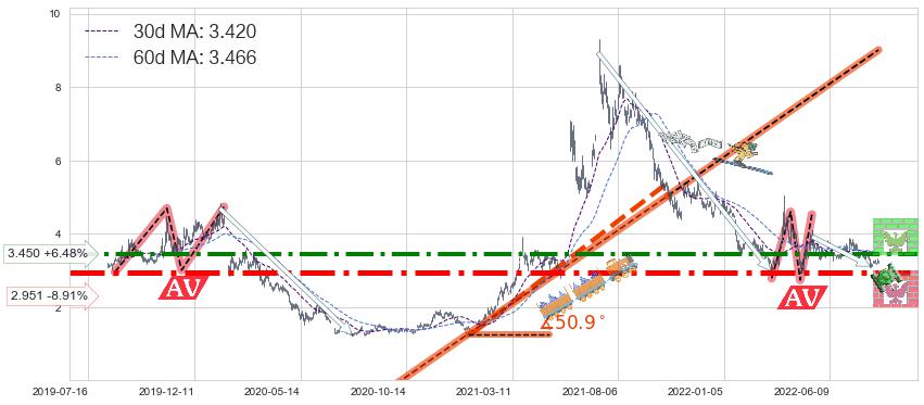 ♘ 阻力价格位3.450,可信任强度77.21%,距离最后交易2022-08-12形成的收盘价格3.240相差 +6.48%