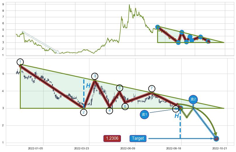 ➣ 最小中继整理跌幅→𝐇: 1.7594 (下侧直角边第一支撑点②与斜边垂直距离)