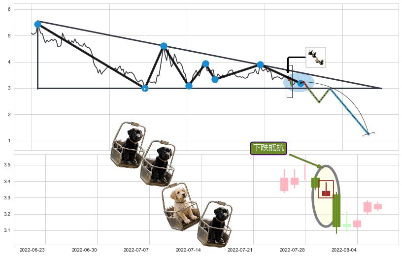 ➢ AI智能: 预测【多空防线逐步靠近→双方接火→空方占优】下降三角形中继整理向下突破,预测将在2022-08-17突破颈线, 演变成下降通道