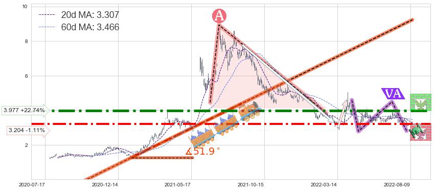 ♘ 阻力价格位3.977,可信任强度88.55%,距离最后交易2022-08-12形成的收盘价格3.240相差 +22.74%