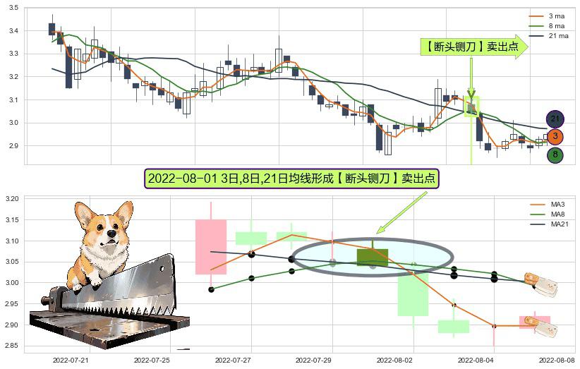⚀ 2022-08-01日显现 3日-8日-21日均线 【断头铡刀】卖出点 看空信号,后市看跌,卖出