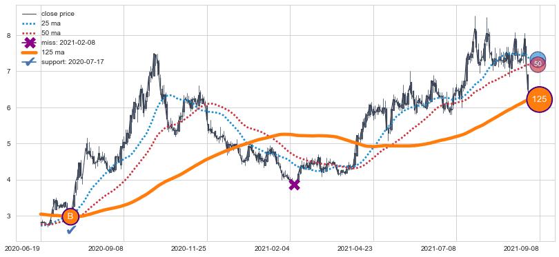 ⚅ 卖点向下突破均线后,价格走势有持续向下的迹象,但动能稍显不足,迟迟不能远离均线