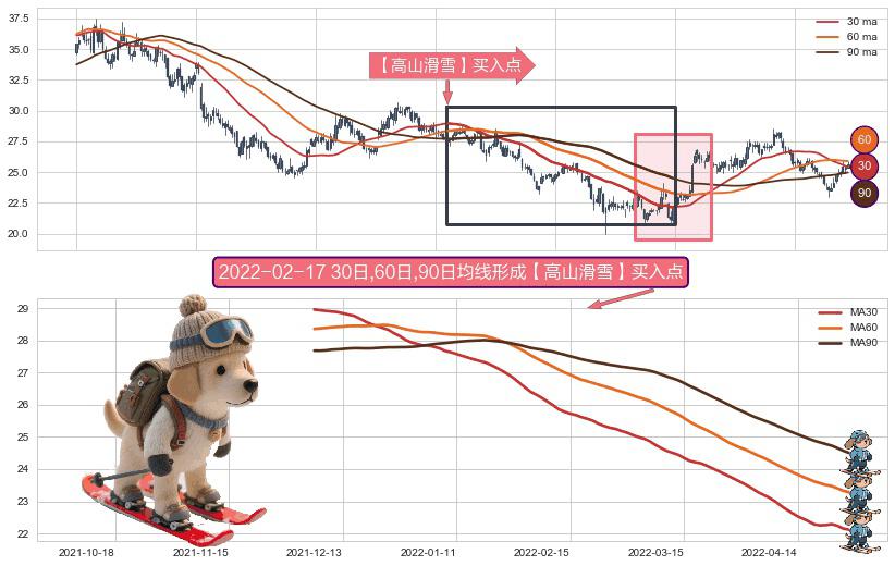 ⚀ 2021-12-06日-2022-04-27日显现 30日-60日-90日均线 【高山滑雪】买入点 看多信号,后市看涨,买入