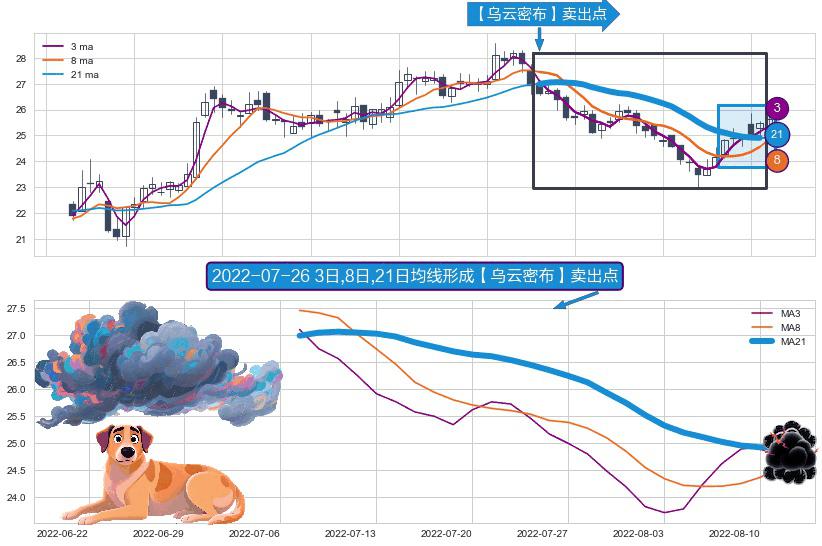 ⚀ 2022-07-07日-2022-08-11日显现 3日-8日-21日均线 【乌云密布】卖出点 看空信号,后市看跌,卖出