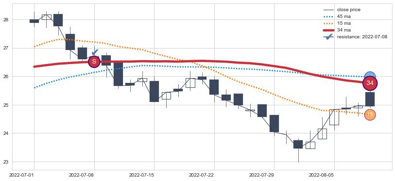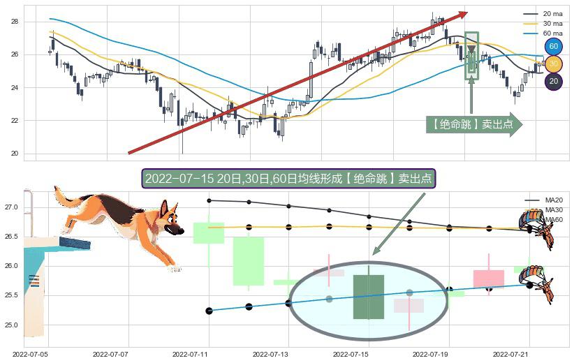 ⚀ 2022-07-15日显现 20日-30日-60日均线 【绝命跳】卖出点 看空信号,后市看跌,卖出
