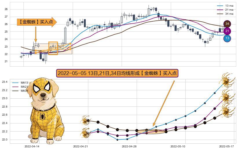 ⚀ 2022-05-05日显现 13日-21日-34日均线 【金蜘蛛】买入点 看多信号,后市看涨,买入