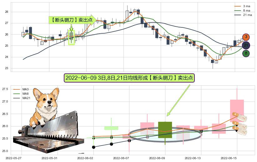 ⚀ 2022-06-09日显现 3日-8日-21日均线 【断头铡刀】卖出点 看空信号,后市看跌,卖出