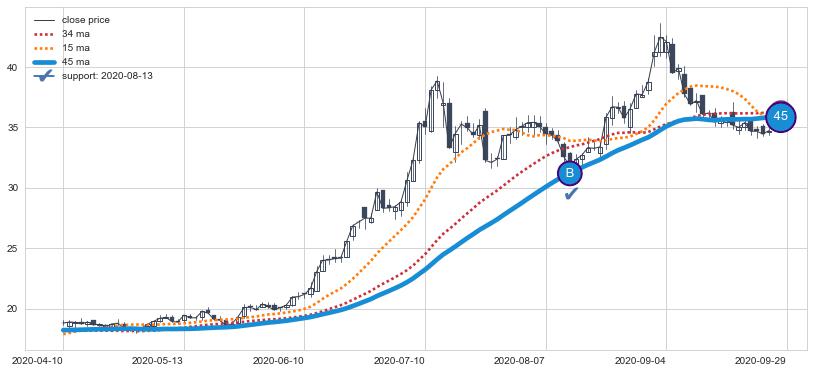 ⚀ 中期均线MA21上穿长期均线MA34形成的交叉是标准 黄金交叉