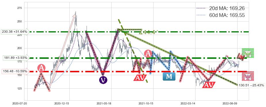♘ 阻力价格位181.89,可信任强度87.25%,距离最后交易2022-08-12形成的收盘价格175.01相差 +3.93%