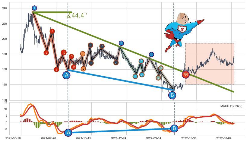 ➢ 2021-06-10-2022-04-29下跌趋势存在反转上涨[机会],其原下跌趋势的阻力位(130.51)已被突破[强支撑信号],原下跌趋势角度: 44.4˚