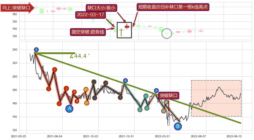 ➢ 收盘价(2022-03-28: 133.40 )→回踩→第一根k线高点(2022-03-16: 139.77 )