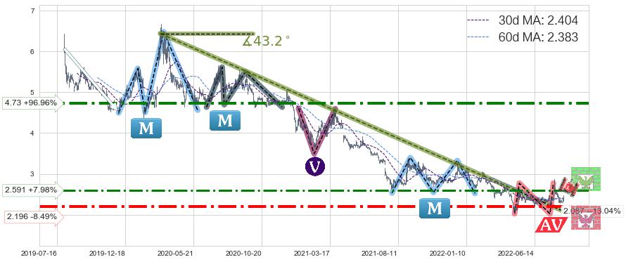 ♘ 支撑价格位2.196,可信任强度77.28%,距离最后交易2022-08-12形成的收盘价格2.400相差 -8.49%