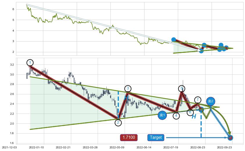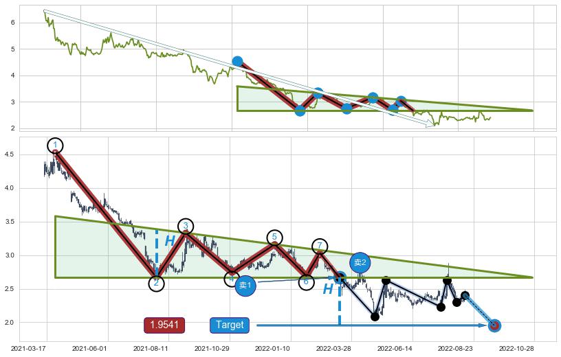 ➣ 【未确认突破,预测即将形成突破】下降【对称】三角形整理起点:2021-12-21, 预测突破点:2022-08-17,形态共160交易日