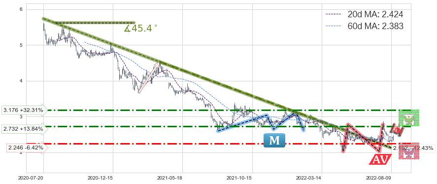 ♘ 支撑价格位2.246,可信任强度61.68%,距离最后交易2022-08-12形成的收盘价格2.400相差 -6.42%