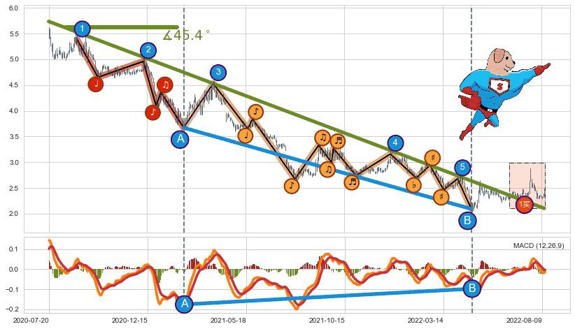 从2020-07-20至2022-05-11,共包含438个交易日,阶段股价下跌-75.75%,阶段股价变动位移路程比: 1 : 8,下跌趋势角度: 45.4