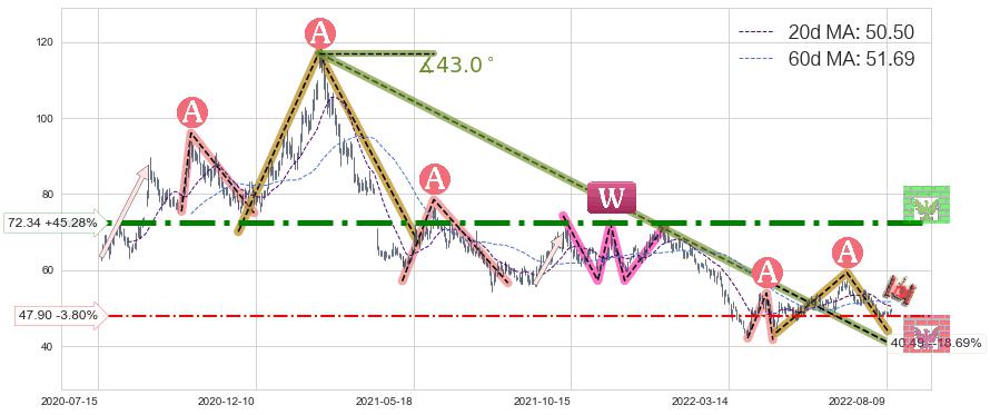 ➣ D点拟合预测价格42.69,距离最后交易收盘价格49.79相差 -14.26%