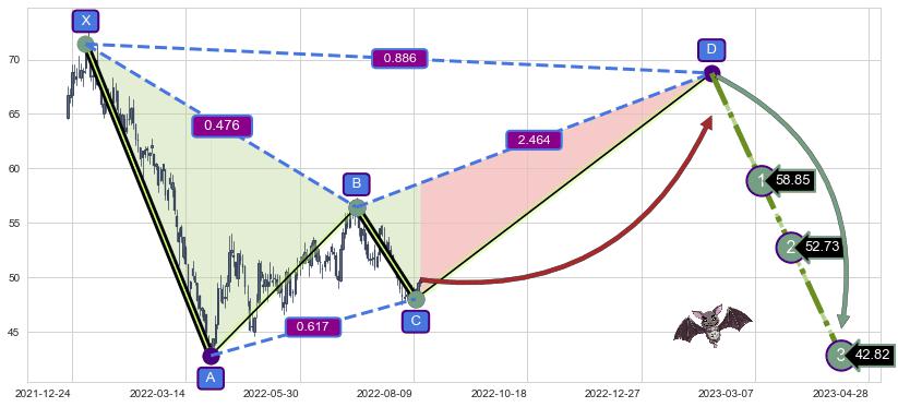 ➣ 未完成【蝙蝠】形态起点X: 2022-01-04, 已到达C点: 2022-08-10, 预测最终D点: 2023-02-08, 共276交易日