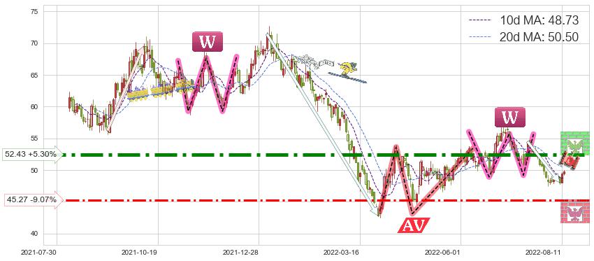♘ 阻力价格位52.43,可信任强度86.65%,距离最后交易2022-08-12形成的收盘价格49.79相差 +5.30%