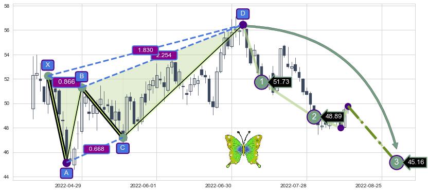 ➣ 已完成【蝴蝶】形态起点X: 2022-06-23, 终点D: 2022-08-10, 共35交易日