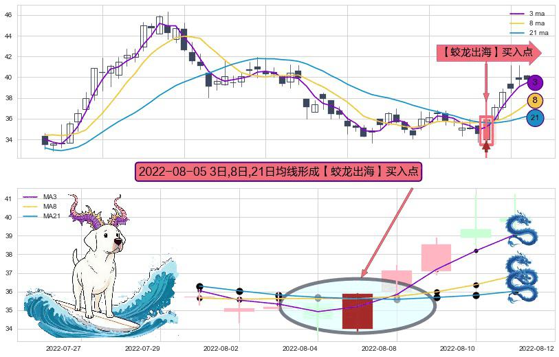 ⚀ 2022-08-05日显现 3日-8日-21日均线 【蛟龙出海】买入点 看多信号,后市看涨,买入