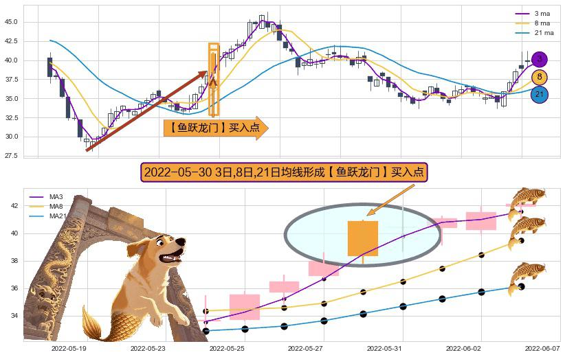 ⚀ 2022-05-30日显现 3日-8日-21日均线 【鱼跃龙门】买入点 看多信号,后市看涨,买入