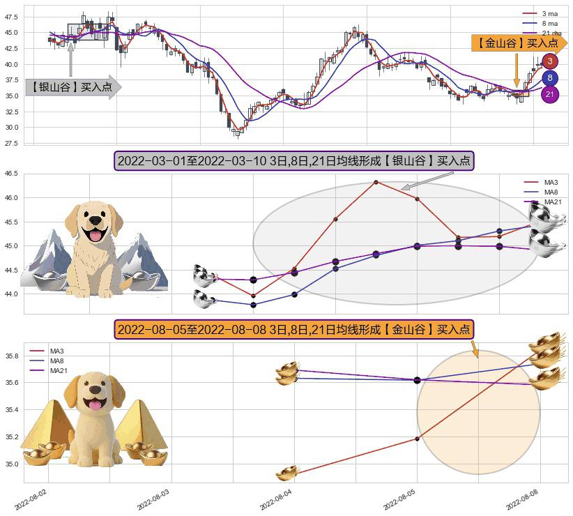 ⚃ 2022-08-08-日至2022-08-08-日显现 3日-8日-21日均线 【金山谷】买入点 其再次确认了买入信号,可靠性更强,买入