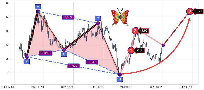 ➣ 已完成【蝴蝶】形态起点X: 2021-08-30, 终点D: 2022-04-27, 共158交易日