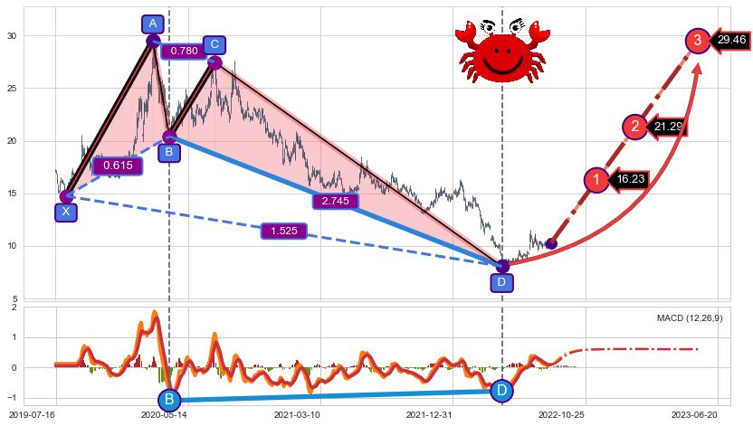 | 20 🅚:上涨两颗星 | 上涨三颗星 ➕ 📡:谐波螃蟹已到达d点:猜想c下行到达d点后报复性拉升上涨(均值回复) ☞ 看多信号 ⇥ 【🅚线】交织【图形】⇥ 综合量化分数: 57 | > |