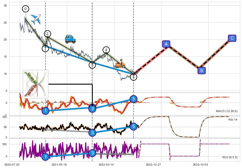 ➢ 1,3,5驱动浪MACD, RSI, KDJ走势都出现【常规背离】反转信号增强