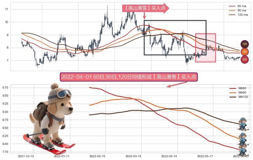 形态多维评估: ⚀ 2022-01-26日-2022-06-08日显现 60日-90日-120日均线 【高山滑雪】买入点 看多信号,后市看涨,买入
