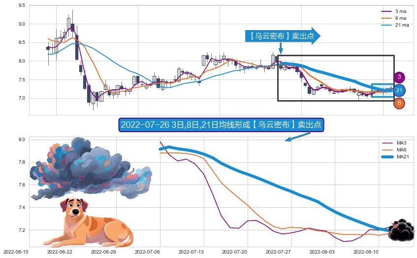 形态多维评估: ⚀ 2022-07-06日-2022-08-12日显现 3日-8日-21日均线 【乌云密布】卖出点 看空信号,后市看跌,卖出