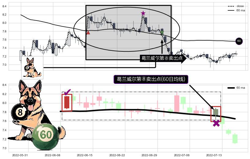形态多维评估: ⚀ 2022-07-12-日显现 葛兰威尔均线 60日均线 第⑧卖出点 下降趋势的中继信号,后市看跌,卖出信号