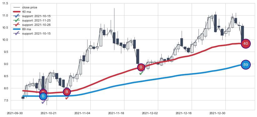 上涨趋势2021-09-30-2022-01-07,均线40, 89确认关键支撑3处