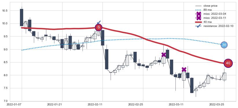 下跌趋势2022-01-07-2022-03-25,均线40确认关键阻力1处