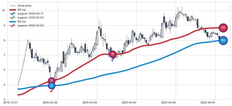 上涨趋势2019-12-31-2020-06-05,均线40, 89确认关键支撑2处