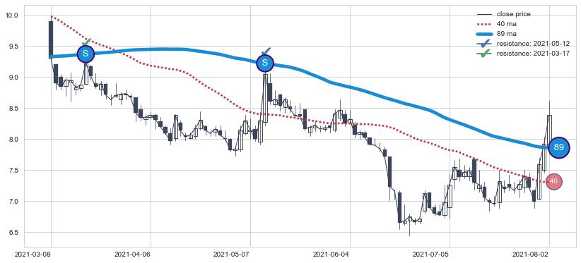 下跌趋势2021-03-08-2021-08-02,均线89确认关键阻力2处