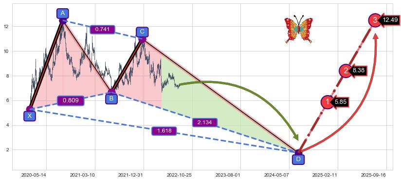 ➣ 未完成【蝴蝶】形态起点X: 2020-02-03, 已到达C点: 2021-12-24, 预测最终D点: 2024-06-28, 共1034交易日