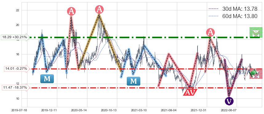 ♘ 支撑价格位14.01,可信任强度64.26%,距离最后交易2022-08-12形成的收盘价格14.05相差 -0.27%