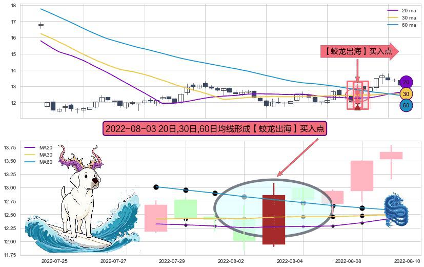 ⚀ 2022-08-03日显现 20日-30日-60日均线 【蛟龙出海】买入点 看多信号,后市看涨,买入